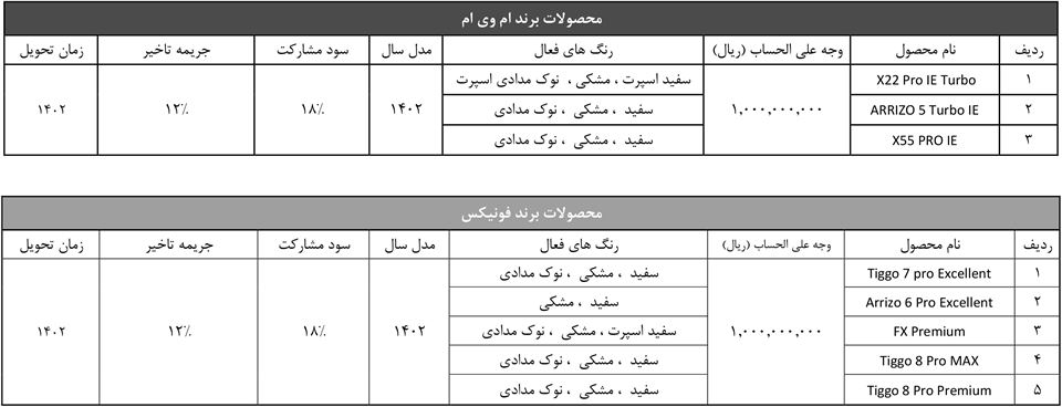 | 1 | مدیران خودرو | فونیکس | تیگو 8 پرو مکس IE | 2,584,400,000 |