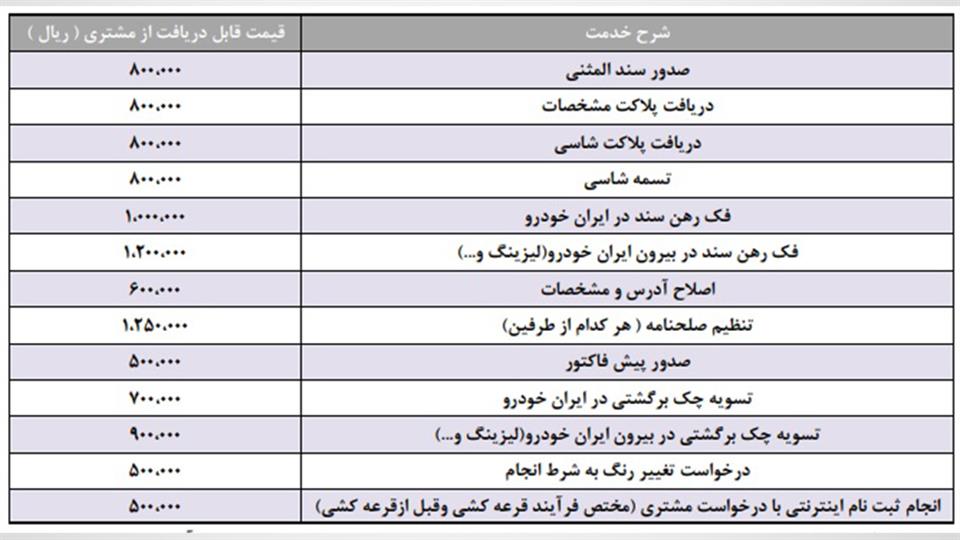 تیر 1401: براساس ابلاغیه جدید شرکت، تعرفه خدمات نمایندگی ایران خودرو از ابتدای تیرماه 1401 و تا اطلاع ثانوی، اعلام شده است. توجه داشته باشید که خدمات ایران خودرو که در جدول زیر به آنها اشاره شده، در خارج از فرآیند ثبت نام تا تحویل خودرو هستند. بنابراین به عنوان خدمات «اختیاری و اضافی» تعیین شدهاند و صرفا با درخواست مشتریان، انجام میگردد: