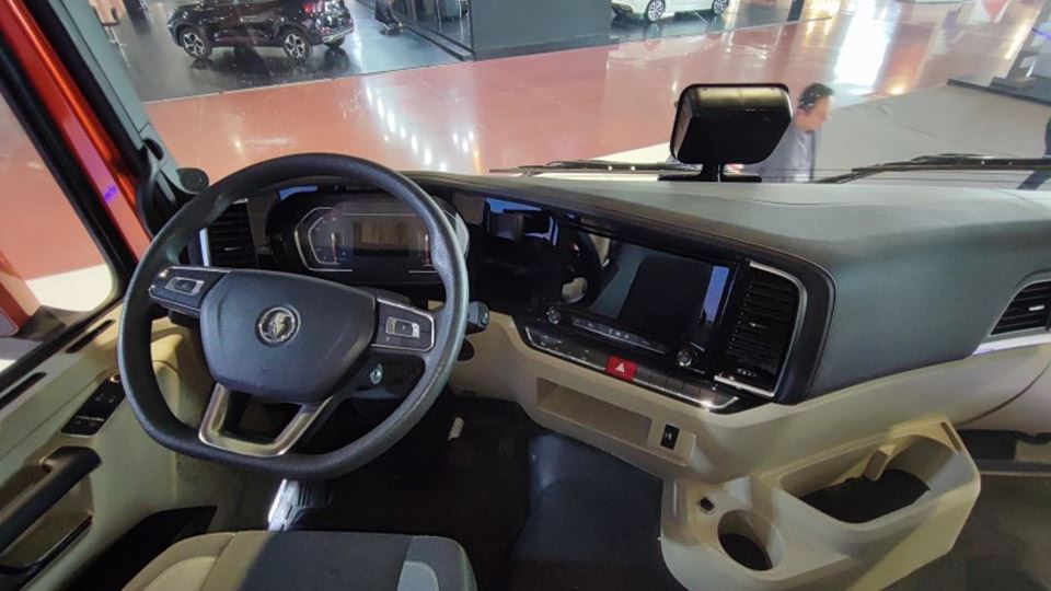 در داخل اتاق نیز شاهد یک طراحی ساده و کاربردی هستیم. داشبورد شبیه به بعضی کامیونها که دارای انبوهی از دکمههای بیاستفاده و شلوغ هستند، نبوده و از این نظر، سادهتر از بسیاری از رقبای خودش هست. در وسط داشبورد، صفحه نمایش در نظر گفته شده برای استفاده سیستم مالتیمدیاست و در زیر آن، دکمه های مربوط به سیستم تهویه مطبوع قرار دارد که البته نمایشگر مالتی مدیا، برای تنظیم شیشهها و آینههای جانبی، کنترل باد تایرها، بررسی خطاهای پیش آمده برای موتور، دوربین 360 و... نیز هست.