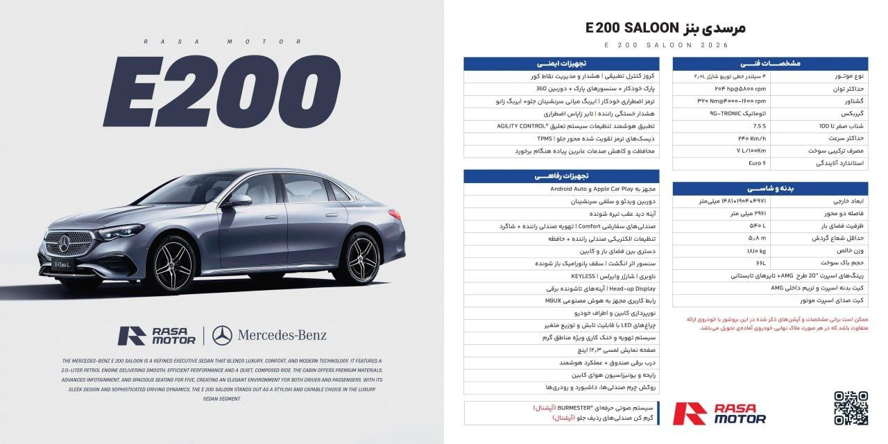 بهمن 1404: سدان کلاس E مرسدس بنز، خودرویی محبوب در بازار است که اکنون قرار است مدل 2026 آن وارد بازار ایران شود. شرکت راسا موتور خاورمیانه، قرار است محصولات جدید بنز را وارد و عرضه کند: