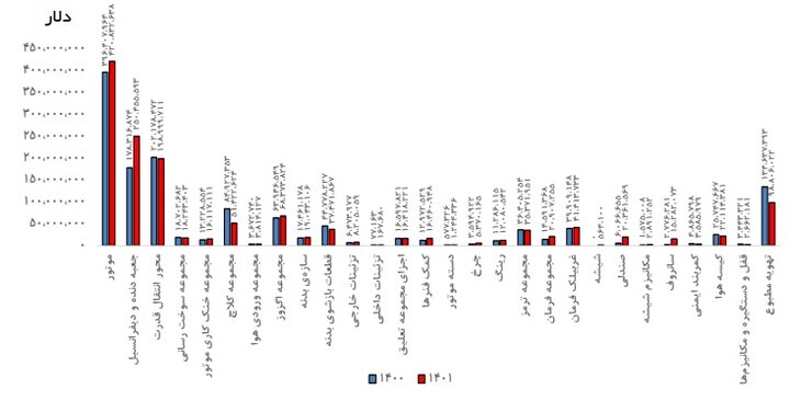 در نمودار دیگر، میزان واردات اجزا و قطعات خودرو در سالهای 1400 و 1401 آمده است که طبق آن بیشترین واردات مربوط به موتور و کمترین واردات نیز مربوط به شیشه بوده است.
