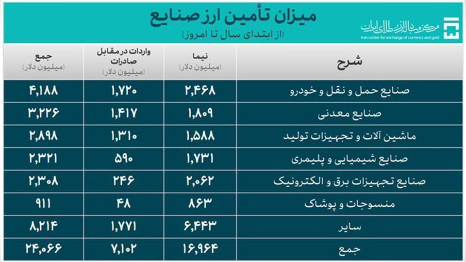 بررسی تامین ارز برای بخش صنعت نشان می دهد که برای این بخش از ابتدای سال جاری تا 4 مهر ماه 25 میلیارد و 79 میلیون دلار ارز تامین شده که 17 میلیارد و 689 میلیون دلار از محل نیما و 7 میلیارد و 390 میلیون دلار از محل ارز واردات در مقابل صادرات بوده است.