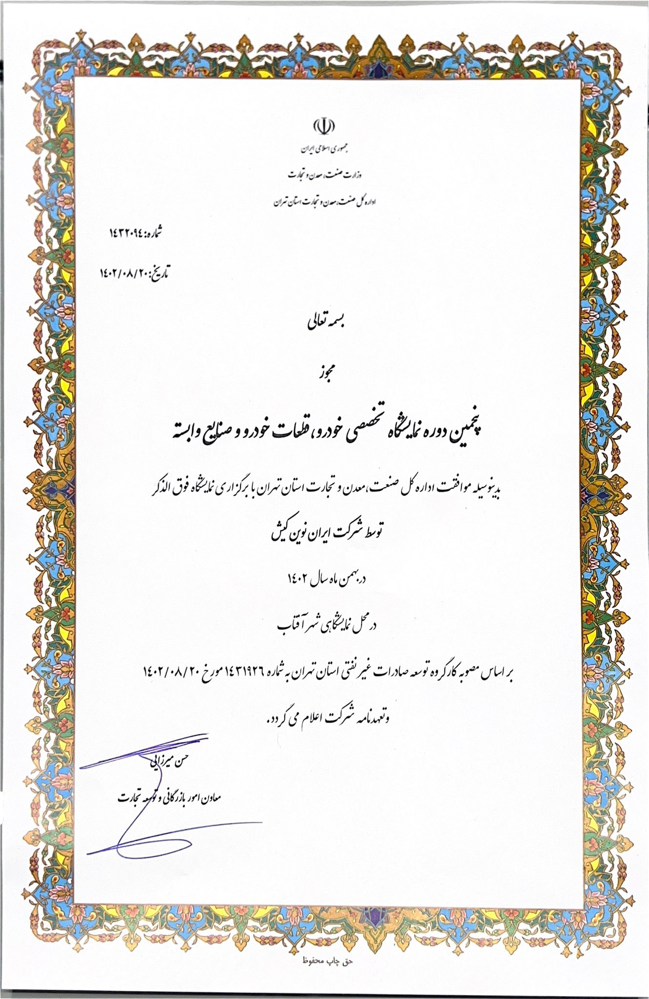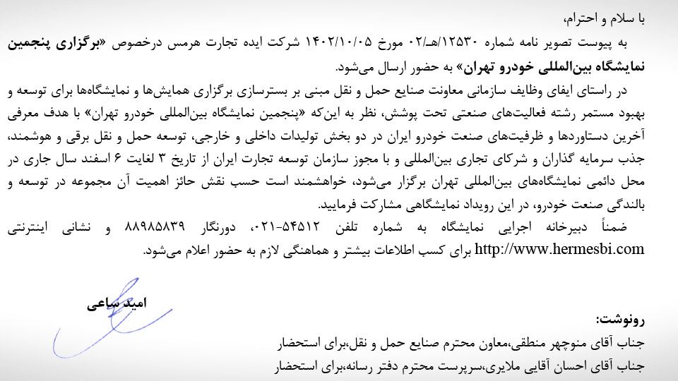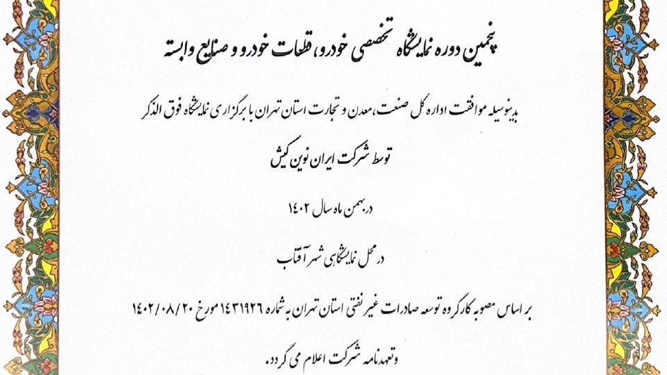 اما همانطور که در تصویر زیر نیز مشاهده میکنید، وزارت صمت در تاریخ 7 دیماه 1402 مجوز جدیدی صادر کرده است که مطابق آن، این نمایشگاه خودرو، قرار است توسط شرکت دیگری در اوایل اسفندماه 1402 و در محل دائمی نمایشگاههای بینالمللی شهر تهران نیز برگزار شود. نکته عجیب ماجرا اینجاست که وزارت صمت، نام این نمایشگاه را هم «نمایشگاه بین المللی تهران» عنوان کرده و حتی عبارت «پنجمین دوره» را هم برای آن انتخاب کرده است!