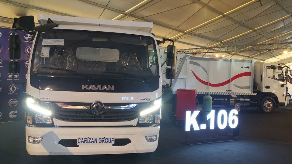 چهره کامیونت کاویان K106 اصلاح شده و موتور 3.8 لیتری کامینز دارد. این محصول سالهاست که در بازار حضور دارد و با کاربریهای کمپرسی و حمل زباله در این نمایشگاه ارائه شد.