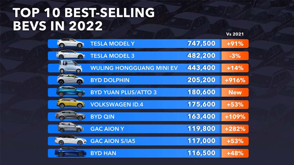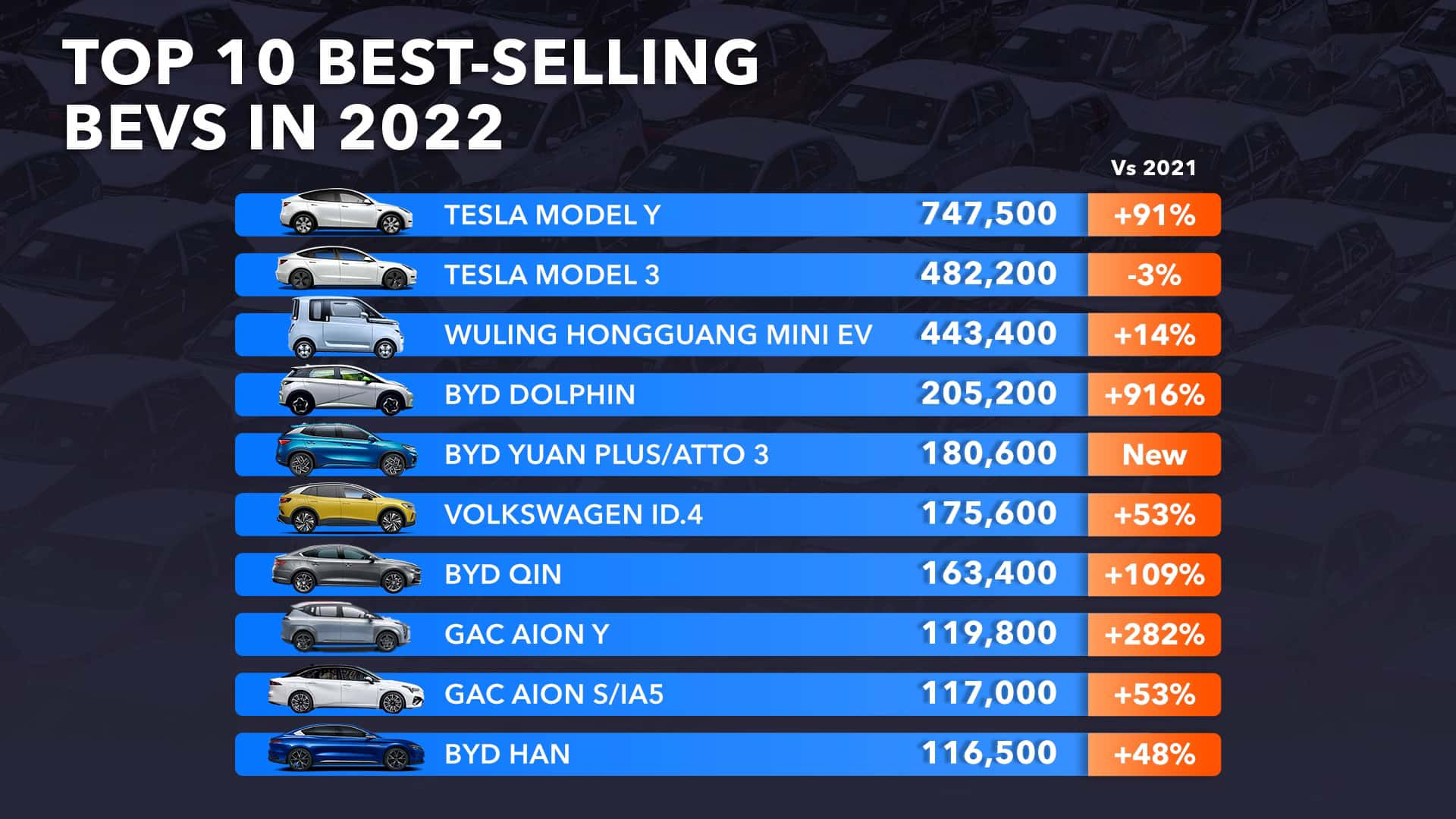 هونگگوانگ مینی EV تنها خودرویی نیست که در رده بندی دیده میشود. بیوایدی دلفین، بیش از ۲۰۰ هزار دستگاه فروخته است. دلفین بیشتر از وولینگ پتانسیل حضور در بازارهای خارجی را دارد. این موضوع ممکن است درباره بیوایدی یوآن پلاس، که با نام Atto 3 نیز شناخته میشود، صدق کند.