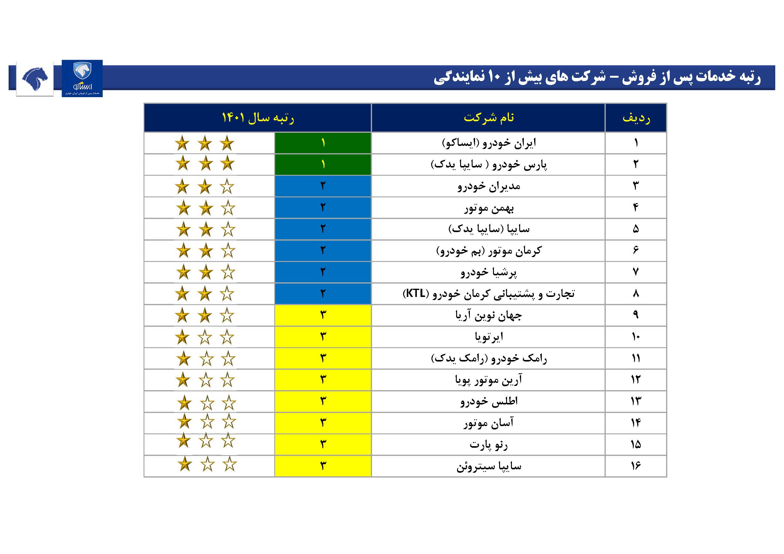 برآیند امتیاز شرکت ایساکو در ارزیابی فرآیندها، زیرساختها و عملکرد، مطابق بازنگری چهار ﺷﺮاﯾﻂ و ﺿﻮاﺑﻂ ﺧﺪﻣﺎت ﭘﺲ از ﻓﺮوش که نشات گرفته از قانون حمایت از مصرف کننده است، برابر با ۸۶.۷ بوده و این امتیاز ۳۵ درصد بالاتر از متوسط خط صنعت و همچنین فراتر از تمامی شرکتها در زمینه خدمات پس از فروش خودرو بوده است. لازم به ذکر است، بیش ترین رشد شرکت اﯾﺴﺎﮐﻮ ﺑﺮ اﺳﺎس دﺳﺘﻮراﻟﻌﻤﻞ ارزیابی بازنگری چهار ﺷﺮاﯾﻂ و ﺿﻮاﺑﻂ ﺧﺪﻣﺎت ﭘﺲ از ﻓﺮوش در بخش ارزیابی نمایندگیها و رضایت مشتریان بوده؛ همچنین علاوه بر افزایش امتیاز شاخص رضایت مشتریان، شاخص رضایت نمایندگیهای مجاز نیز از پشتیبانی این شرکت در تحقق خواستههای مشتریان افزایش یافته است.
