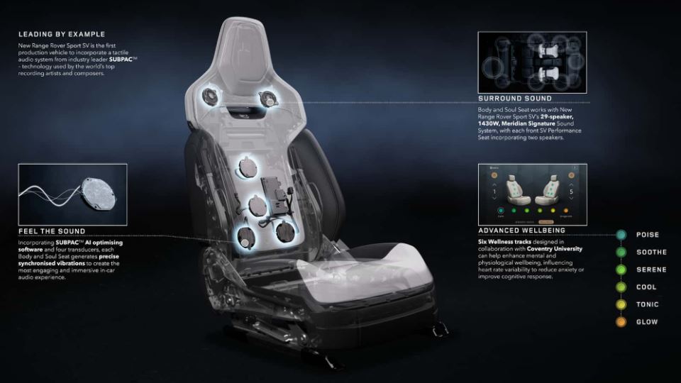 شش موسیقی با حال و هوای متفاوت نیز به صورت انحصاری برای رنجرور اسپرت SV ساخته شده است، که هماهنگ با عملکرد صندلیهای معروف به BASS این خودرو راننده و سرنشین جلو را در موسیقی غرق کنند.