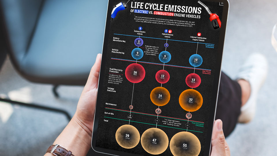 در جدول زیر به طور اجمالی میزان انتشار هر یک از انواع خودروهای الکتریکی، هیبریدی و احتراق داخلی با سایز متوسط بر حسب tCO2e - میزان آلاینده منتشر شده معادل با تن CO2 - ذکر شده است. این اطلاعات بر اساس عمر مفید 16 سال و مسافت 240,000 کیلومتر محاسبه شده است.