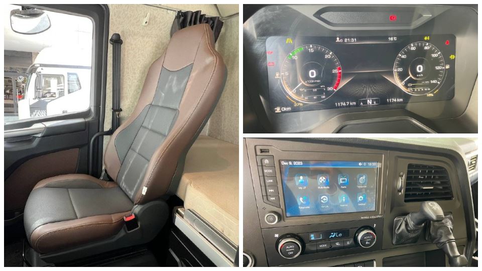 در نگاه اول به داشبورد این کشنده میتوان گفت که از مرسدسبنز آکتروس الگوبرداری شده است. طرحی ساده با خطوط تیز که حتی طرح کلی فرمان نیز، شباهت زیادی به فرمان مرسدسبنز آکتروس دارد. مجموعه نمایشگرهای پشت فرمان، کاملاً دیجیتالی هستند که امروزه به عنوان سبکی جدید در خودروهای سواری و تجاری، استفاده میشوند. داشبورد در کل، طرحی ساده و زیبا دارد که با کف تخت کابین و نوارهای خاکستری، فضای داخلی یک کشنده بهروز را تداعی میکند. صفحهنمایش وسط داشبورد، آنچنان بزرگ نیست که در چشم باشد؛ اما باتوجهبه کاربری که برای آن در نظر گرفته شده است، کافی خواهد بود.