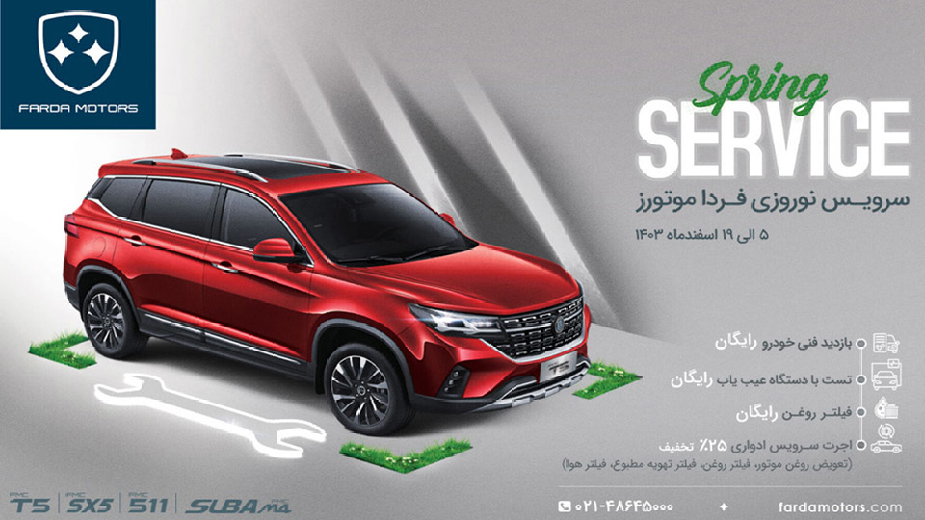 کلینیک خدمات پیش از سفر فردا موتورز از تاریخ 5 اسفند ماه 1403 آغاز خواهد شد. این طرح تا پایان روز 19ام اسفندماه در جریان بوده و مالکان خودروهای برند FMC در سراسر کشور میتوانند از خدمات این طرح استفاده کنند. متقاضیان استفاده از خدمات این طرح، میتوانند جهت کسب اطلاعات بیشتر و دریافت نوبت با شماره 48645000-021 تماس گرفته و یا به یکی از مراکز خدمات پس از فروش فردا موتورز مراجعه نمایند.