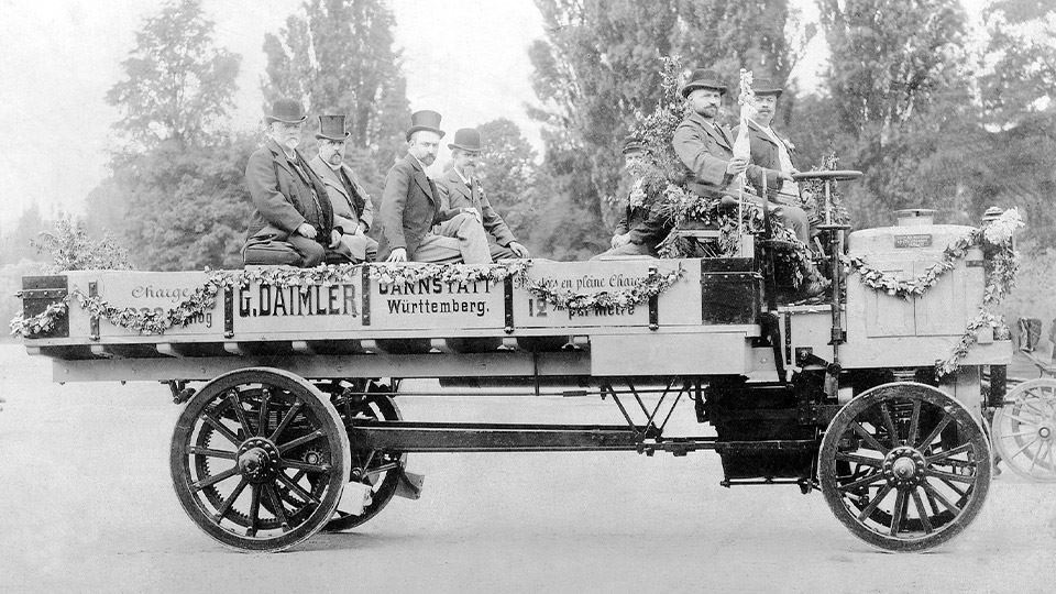 اولین کامیون دنیا توسط گوتلیب دایملر در سال 1896 ساخته شد. این کامیون که اولین کامیون دنیا بود، همان واگنهای بخاری بود که حالا به جای اسب یا موتور بخار از یک موتور بنزینی نیرو میگرفت. خودروی دایملر موتوری با دو سیلندر و 4 اسب بخار قدرت داشت و با بنزین تغذیه میشد. چرخهای آن چوبی و با آهن تقویت شده بود. همچنین سیستم انتقال قدرت این وسیله دو دنده جلو و یک دنده عقب داشت و با تسمه نیرو به چرخها منتقل میشد.