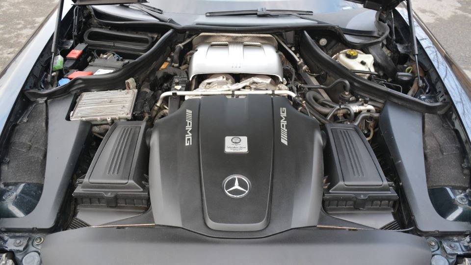 خُب این هم اصل ماجرا. پیشرانهای که بیشتر شبیه بوستر یک موشک بالستیک است تا قوای محرکه یک خودرو. مرسدس-ای.ام.جی جیتی اِس با یک پیشرانه 4 لیتری هشت سیلندر Vشکل دو توربو تولید شده که 503 اسببخار قدرت و 700 نیوتنمتر گشتاور دارد. البته این قویترین نسخه در خانواده GTها نیست. تیپ R Pro با همین پیشرانه 577 اسببخار قدرت تولید میکند. این نشان از مهندسی بسیار سطح بالای قوای محرکه فوق دارد.