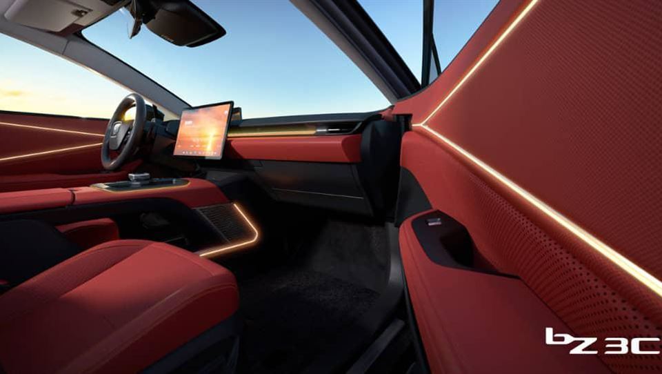 فضای کابین تویوتا bZ3C که در عمل جانشین نسخه برقی C-HR خواهد بود، با رنگ قرمز تزئین شده است. نمایشگر لمسی معلق روی بخش میانی داشبورد و صفحه نشان دهنده زیر شیشه جلو قرار دارد.