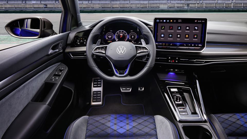 فضای کابین گلف R مدل 2025، مواردی شامل صفحه پشت آمپر 10.2 اینچی و نمایشگر لمسی 12.9 اینچ با گرافیک اختصاصی R، زمانسنج پیست همراه با GPS و G Meter برای ثبت شتاب صفر تا صد را به همراه دارد. متاسفانه دکمههای لمسی برجای خود باقی مانده، اما اکنون به نور پسزمینه مجهز شده است. نمایشگر هداپ (نمایشگر مجازی روی شیشه) را نیز میتوان سفارش داد.