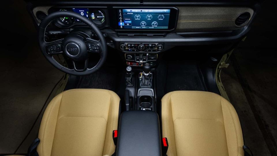 در فضای کابین جیپ رانگلر 4xe ویلیز ’41 با روکش پارچهای به رنگ بژ، نشان 41 روی اهرم دنده و جزئیات پارچهای روی داشبورد به رنگ سبز زیتونی، روبرو هستیم.