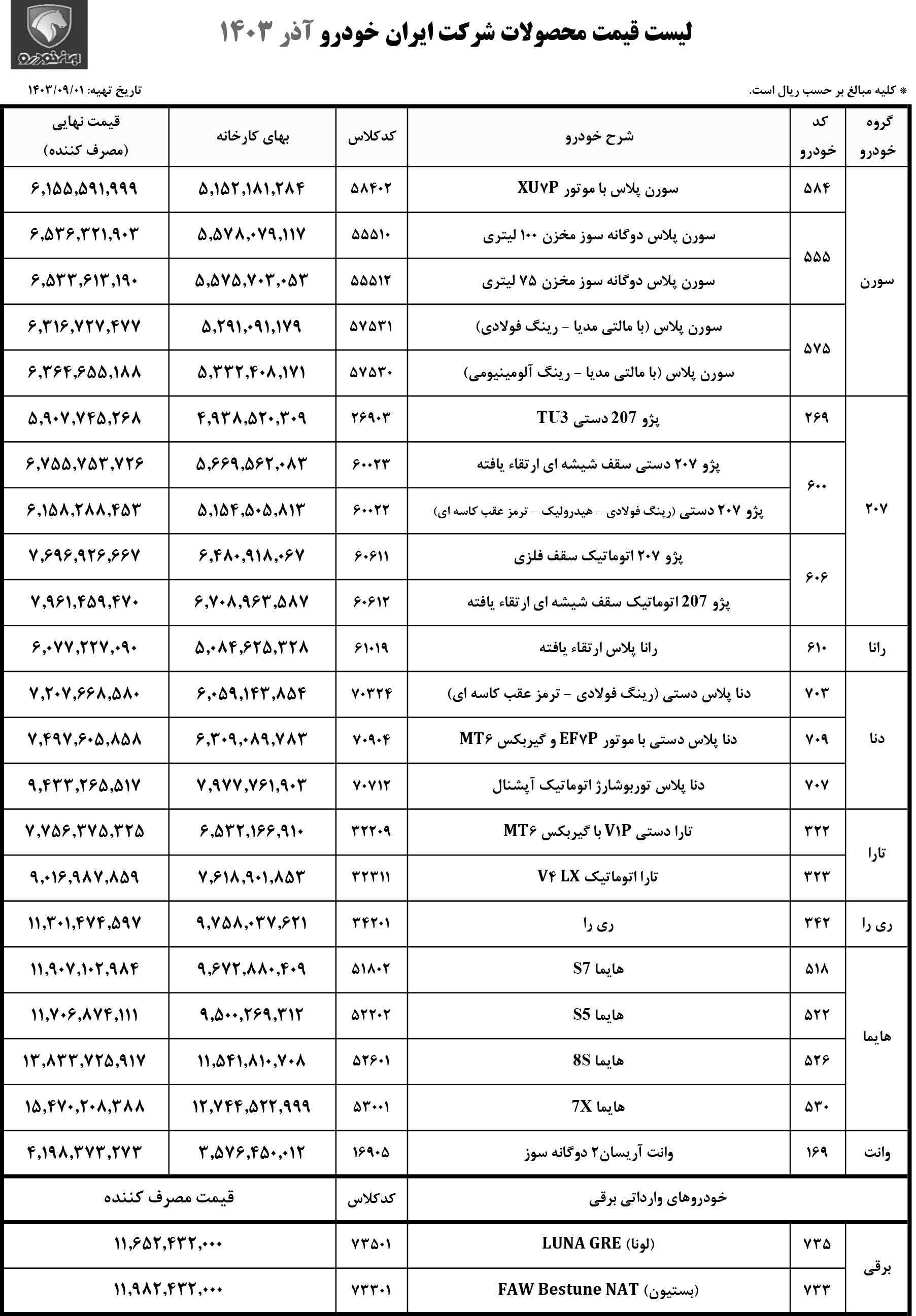 شرکت خودروسازی ایران خودرو، پس از کسب مجوزهای قانونی، لیست نهایی قیمت انواع محصولاتش را در تاریخ یکم آذرماه 1403 منتشر نمود؛ قیمت انواع محصولات تولید داخلی این شرکت، به طور متوسط حدود 30 تا 35 درصد گران شدهاند.
