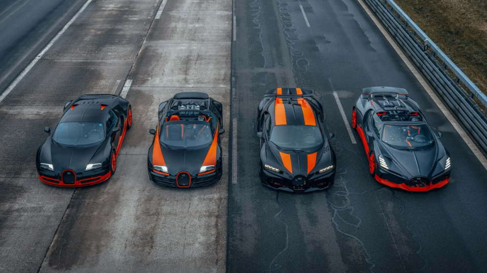 گذشته از پیشرانههای نیرومند، باید توجه داشت که با چهار خودروی تاریخساز روبرو هستیم. ویرون و همتای روباز آن یعنی گرنداسپرت ویتس توانستند به ترتیب رکورد سرعت 431.07 و 408.84 کیلومتر برساعت را به ثبت برسانند. شیرون هم توانست جانشین خوبی برای مدل قبلی باشد و توانست به سرعت 490.48 کیلومتر برساعت دست پیدا کند. همتای روباز این خودرو یعنی میسترال هم توانست رکورد 453.91 کیلومتر بر ساعت را ثبت کند.