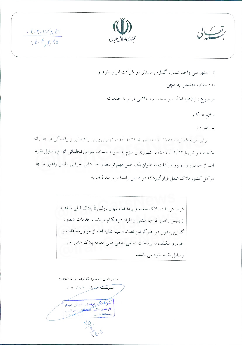 اردیبهشت 1404: همانطور که میدانید از تاریخ 1404/02/22 شماره گذاری انواع وسایل نقلیه، مشروط به پرداخت خلافی شده است و در غیر اینصورت، امکان شماره گذاری خودرو وجود نخواهد داشت. در همین راستا، پلیس راهور با انتشار اطلاعیهای که در تاریخ 1404/02/25 به مراکز شماره گذاری ابلاغ شده است، قانون شرط دریافت پلاک ششم (به شرط پرداخت دیون دولتی برای پلاک پنجم) را لغو کرده است.