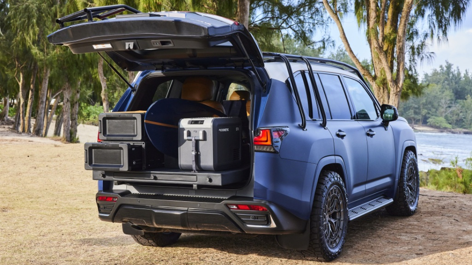 با ورود به فضای کابین لکسوس ال ایکس Surf با روکش چرم قهوهای روشن و سایر موارد قابل مشاهده در کابین یک شاسیبلند لوکس، مواجه هستیم. البته همانطور که انتظار دارید، محفظه بار نیز به لوازم موردنیاز برای یک علاقمند به موج سواری شامل چند کشو، قفسه تخته و خنک کننده Dometic، مجهز شده است.