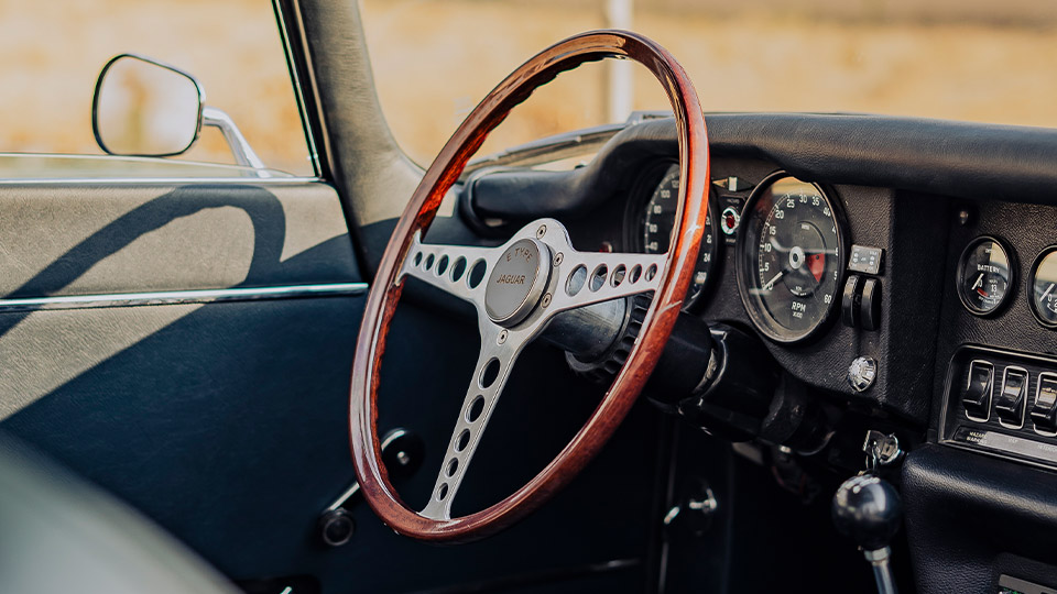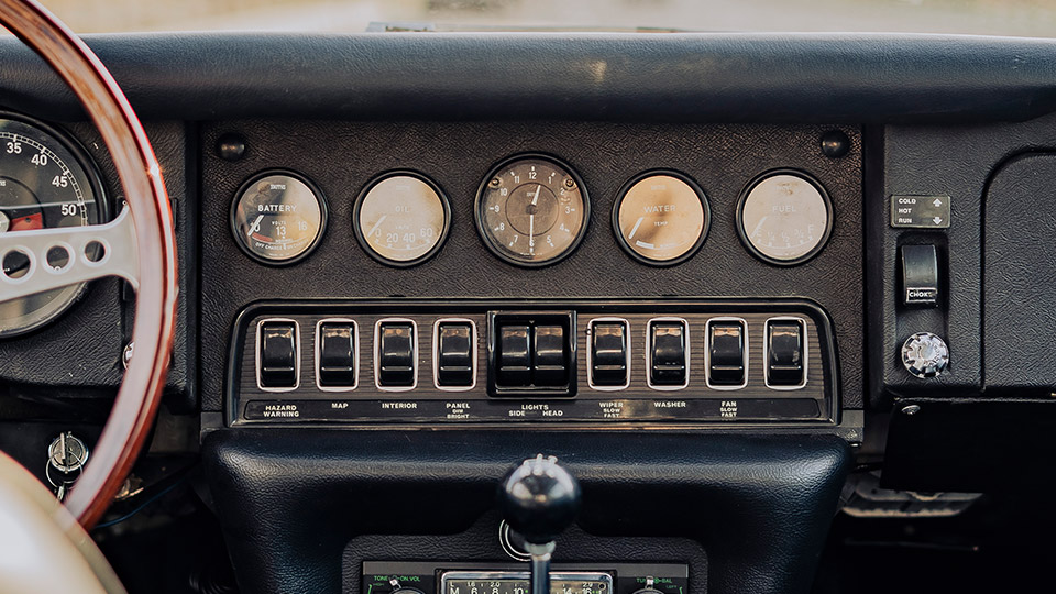 در پشت غربیلک فرمان سه شاخه سوراخدار، مزین به تریم چوبی با نشان Jaguar، دو گیج آنالوگ بسیار بزرگ قرار دارد که در سمت چپ نشانگر سرعت و در سمت راست نشانگر دورشمار موتور دیده میشود. در بخش مرکزی کابین سایر نشانگرهای آنالوگ 5 گانه شامل شارژ باتری، فشار روغن، دمای آب، حجم باک سوخت و در میان آنها ساعت قدیمی با عقربههای سفید رنگ، کاملا منطبق ساختار کلی نشانگرها، منظرهای غیر قابل فراموشی به نمایش میگذارد.