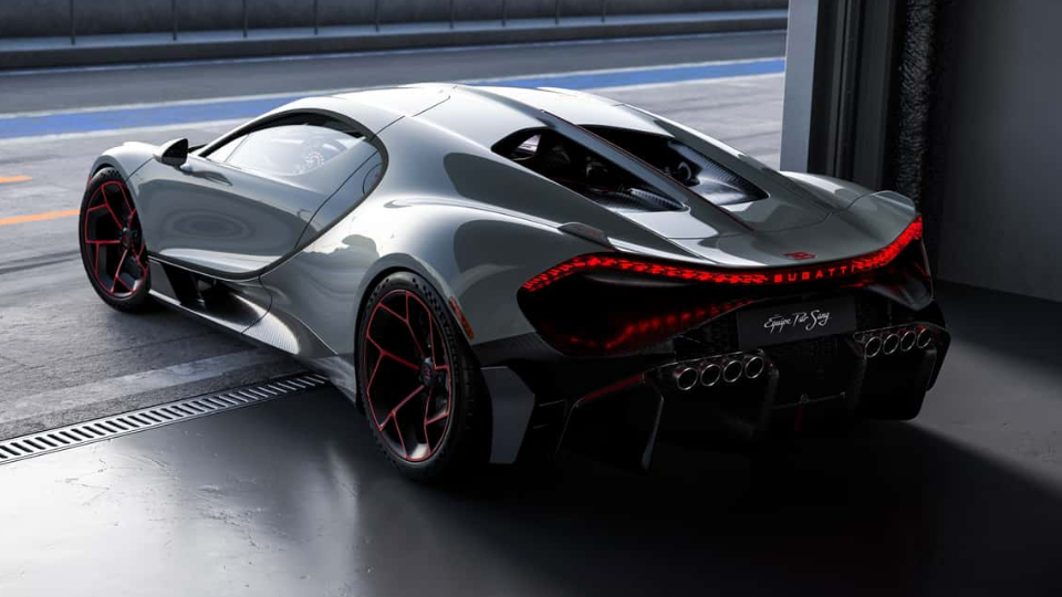 این 8 خروجی اگزوز که از دو گروه 4 تایی در طرفین تشکیل میشود، در کنار باله تاشو و دیفیوزر عقب جدید قرار میگیرد. بنابر اعلام بوگاتی، این دو مورد آخر با توجه به افزایش نیروی رو به پایین و کاهش مصرف سوخت طراحی شدهاند.