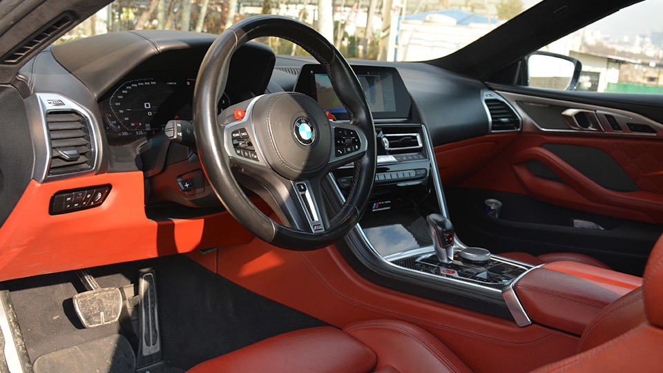 نمایشگر اصلی 1025 اینچی است. سایزی منطقی و عقلانی برای یک خودروی بااصالت. نمایشگر پشت فرمان هم 12.3 اینچی تمام دیجیتال است. هدآپ در M8 فوق چیزی فراتر از سرعت را نشان میدهد. درواقع روی شیشه جلو میتوان نقشه مسیر و محدودیتهای راهنمایی و رانندگی را هم مشاهده کرد. فرمان چرم، نورپردازی داخلی و شارژر بیسیم موبایل که گفتن ندارد.