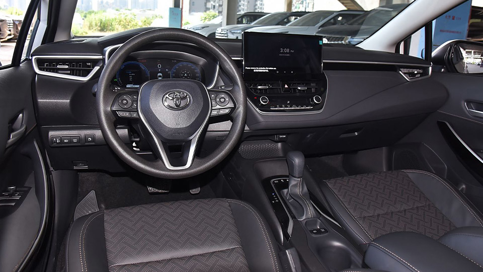 در کابین تویوتا لوین با همان چیزی مواجه هستید که از یک تویوتای مدرن انتظار میرود: طرحی چشمنواز و نه چندان شلوغ ولی کاربردی که هرچند در برخی قسمتها از پلاستیک خشک ساخته شده است ولی کیفیت ساخت و مونتاژ بالایی دارد. در بخش بالایی داشبورد با متریال بهتری روبرو هستیم ضمناینکه محل قرارگیری نمایشگر هم دید بهتری را به ارمغان میآورد. برخلاف تیپ بنزینی، صفحه نشان دهنده تویوتا لوین هیبرید به صورت دیجیتال است.