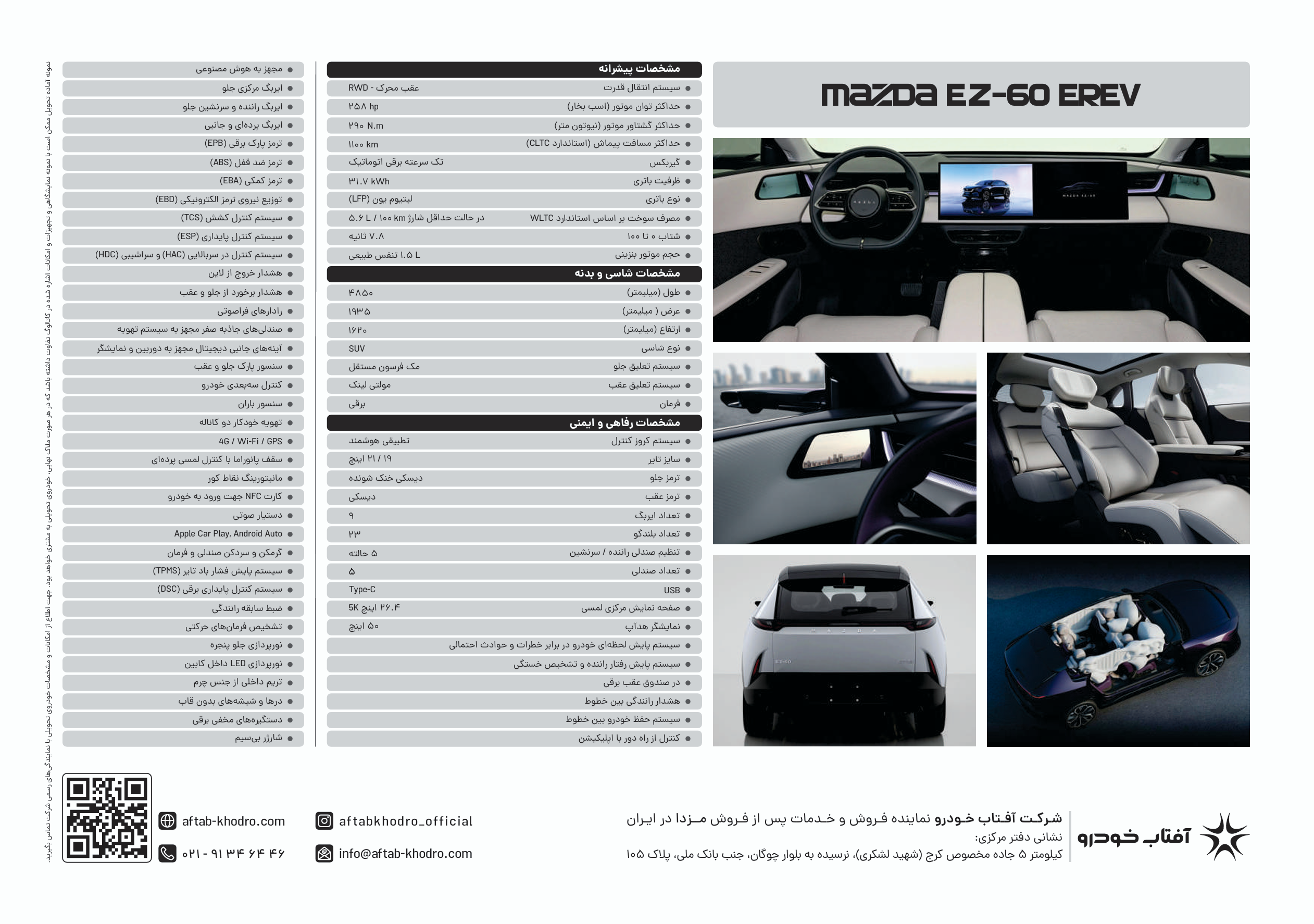 آذر 1404: شرکت آفتاب خودرو، به عنوان واردکننده محصولات مزدا در ایران، اکنون کاتالوگ رسمی کراس اور برقی مزدا را منتشر کرده است. مزدا EZ-60 یک کراس اور با پیشرانه بردافزا بوده که مخصوص بازار چین است که قرار شده به زودی در ایران توسط آفتاب خودرو عرضه شود: