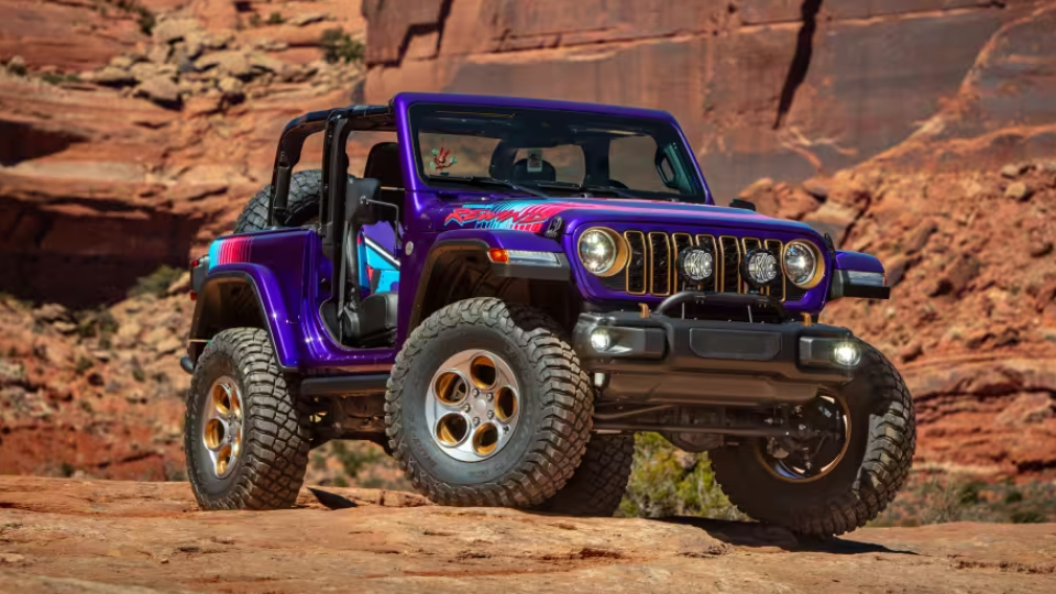 این رانگلر بدون سقف و در، تا حد زیادی به محصولات جیپ در دهه 80 و 90 میلادی شباهت دارد. رنگ بنفش Grimace به همراه نقوش گرافیکی با روکش پارچهای صندلیها و رینگهای 17 اینچ AEV همراه شده است.