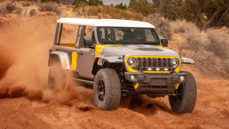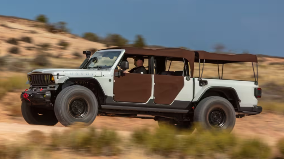 کانسپت جیپ Convoy برمبنای گلادیاتور Mojave مدل 2025 و البته با تاثیر از گلادیاتور SJ مدل 1963 شکل گرفته است. هفت میله جلوپنجره، تزئین بدنه با رنگ Ghost Ops، درها از جنس پارچه و رینگهای 17 اینچ فولادی Warn، این کانسپت را به یک مدل خاطرهانگیز بدل کرده است. البته تایرهای 40 اینچ Krawler ساخت بیاف گودریچ و وینچ با ظرفیت 5.4 تن را هم نباید فراموش کرد.