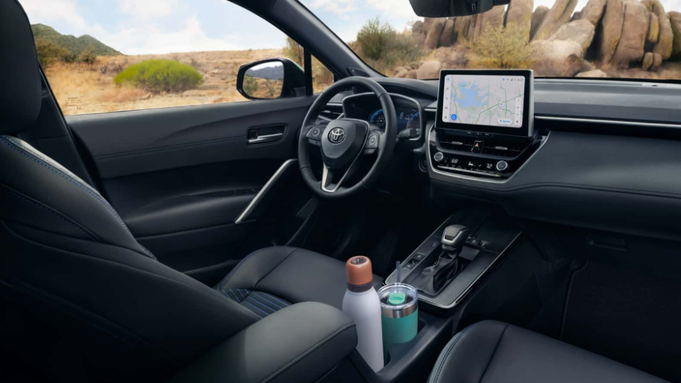 در فضای داخلی، کرولا کراس اکنون مجهز به نمایشگر ۱۰.۵ اینچی سیستم اطلاعات و سرگرمی شده که بالای کنسول مرکزی بازطراحیشده قرار دارد. بسته به تیپ خودرو، پشت آمپر دیجیتال آن نیز ۷ یا ۱۲.۳ اینچ خواهد بود. همچنین چینش دکمهها و پورتها بهبود یافته، محل قرارگیری دسته دنده از جا لیوانی جدا شده و برخی قطعات عمودی در تزئینات داخلی حذف شدهاند. این تغییرات جزئی تأثیر زیادی در بهبود تجربه کاربری دارند.