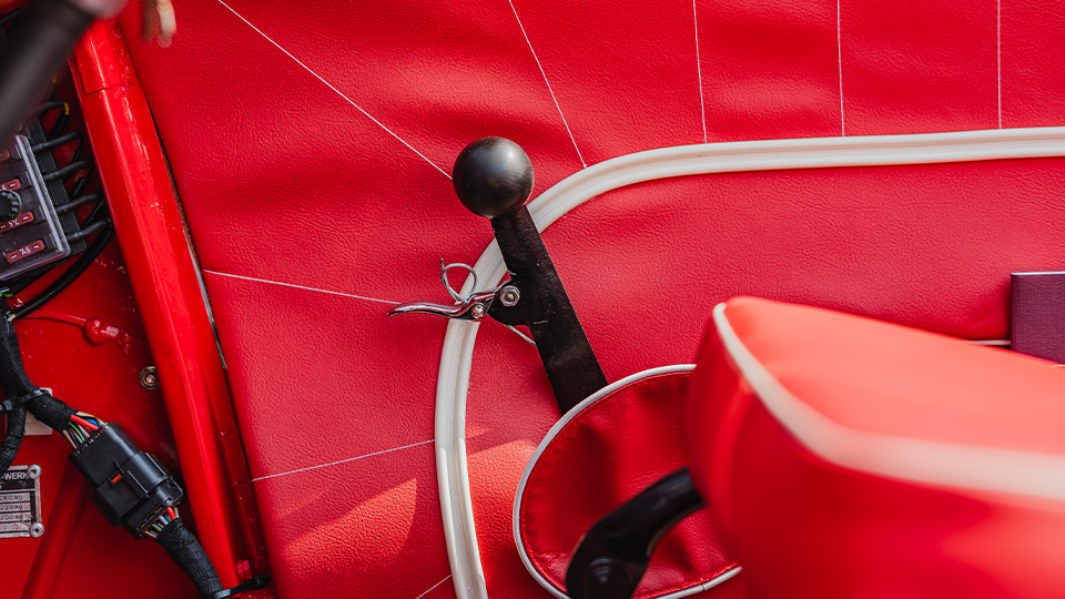 حتی غربیلک فرمان نیز از یک ساختار دوشاخه، درست همانند دستههای دوچرخههای قدیمی دوران تشکیل شده است. سه پدال در زیر پای راننده قرار دارد و اهرم دنده نیز در سمت راست است، تا شباهتهای این وسیله نقلیه بسیار عجیب با یک خودرو واقعی، در همین بخش پایان یابد.