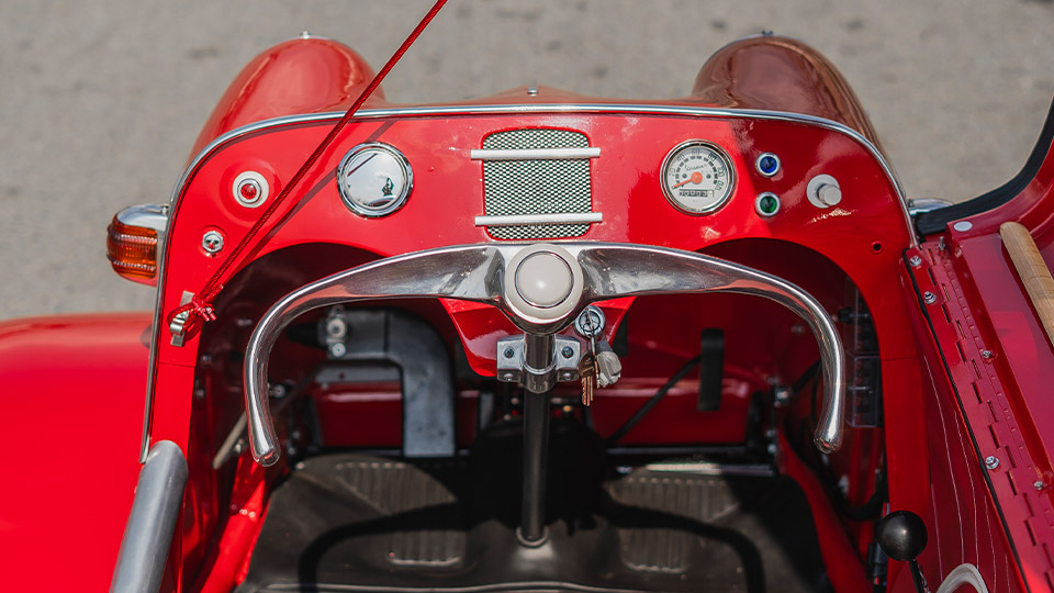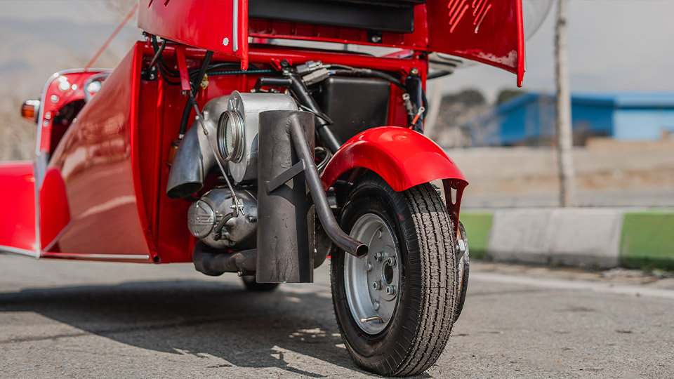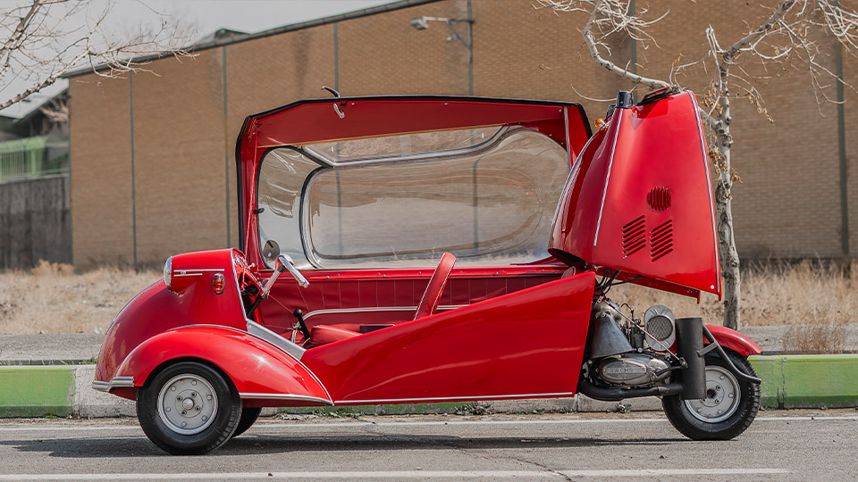 یک گیج سرعت مختصر به همراه چند چراغ نشانگر و چند کلید کنترلی، تمام چیزی است که در مقابل دید راننده قرار دارد. البته فضای داخل کابین با پوشش واینِل (چرم مصنوعی) هم رنگ با بدنه پوشیده شده و انسجام جالبی را به تصویر میکشد، اما این تمام داستان از فضای داخلی کابین مسراشمیت KR200 است. همانطور که گفتیم، این سه چرخه، در عمل یک موتورسیکلت اتاقدار است و از ابتدا نیز قرار نبود بخشی از محتوای درونی آن با یک خودرو استاندارد روز آن دوران رقابت کند.