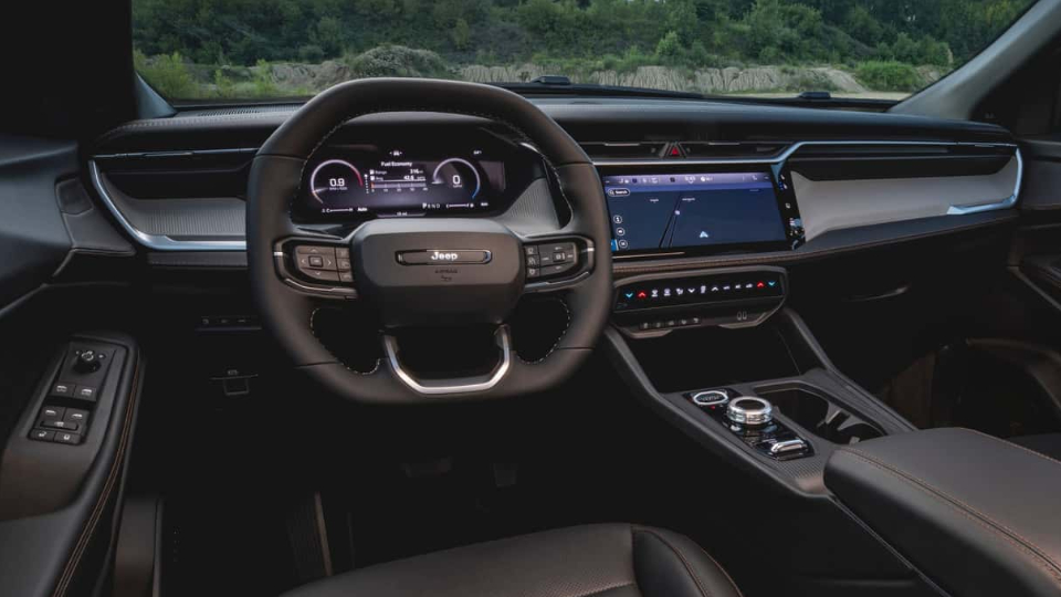 در فضای کابین جیپ چروکی با طرحی کاملا جدید شامل فرمان سه پره، صفحه نشاندهنده 10.25 اینچ، نمایشگر لمسی 12.3 اینچ با رابط کاربری Uconnect 5، تعدادی دکمه برای تنظیمات تهویه، اهرم دایرهای تعویض دنده و دکمه در نقش دستگیره درها روبرو هستیم.