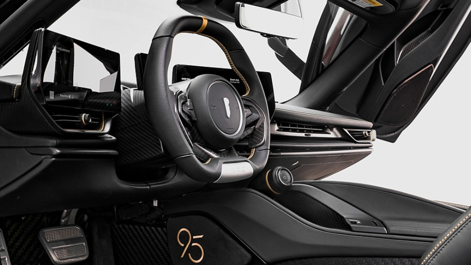 کابین این سوپراسپرت ایتالیایی هم با چرم و آلکانترا به رنگ مشکی و جزئیات طلا، تزئین شده است.