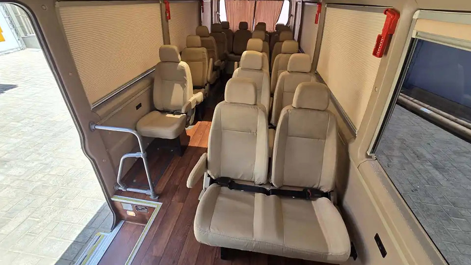 سیستمهای کمکی مثل ترمز هوشمند اضطراری، برنامه کنترل پایداری، سیستم ضدلغزش و ترمز الکترونیکی در کنار رادار خط خوان از دیگر امکانات ایمنی این مینیبوس هستند تا کمک زیادی به راننده برای کنترل این خودرو در مواقع حساس باشند. سیستم تعلیق نیز در هر دو محور از نوع فنر شمش است و خبری از سیستم تعلیق بادی نیست.