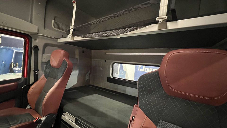 ورود به کابین این کشنده با سه پله نسبتاً عریض و بزرگ انجام میشود. وقتی وارد فضای داخل کابین نیز میشویم، جادار بودن و کیفیت قابلقبول فضای داخل را میتوان دید. طراحی داخلی، ترکیبی از سه رنگ طوسی، قهوهای و مشکی است که حس و حال خوبی به سرنشین میدهد. صندلیها، طراحی خوب و ارگونومیکی دارند و صندلی راننده با داشتن گرمکن و ماساژور، کمک زیادی به آسایش بیشتر راننده در طول مسیر میدهد.