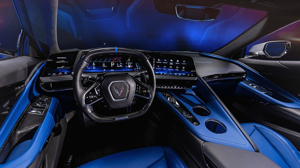 در فضای کابین شورولت کوروت ZR1X مدل 2026 با سه نمایشگر دیجیتال، تعداد کمی دکمه فیزیکی و قطعات فیبرکربن مواجه هستیم.