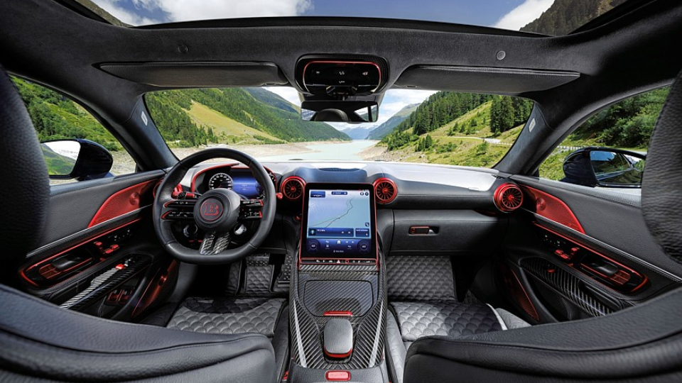 در فضای کابین برابوس راکت 1000 کوپه هم با تریم فیبرکربن در کنسول میانی و پوشش داخلی درها، روکش چرمی مواجه هستیم که علاوه بر صندلیها و فرمان، کف اتاق و محفظه بار را نیز پوشانده است. گذشته از اینها باید به لوگوی B روی فرمان و پشتی صندلیها و همچنین عدد 77 به عنوان نشانهای از سال تاسیس برابوس (1977)، اشاره کنیم.