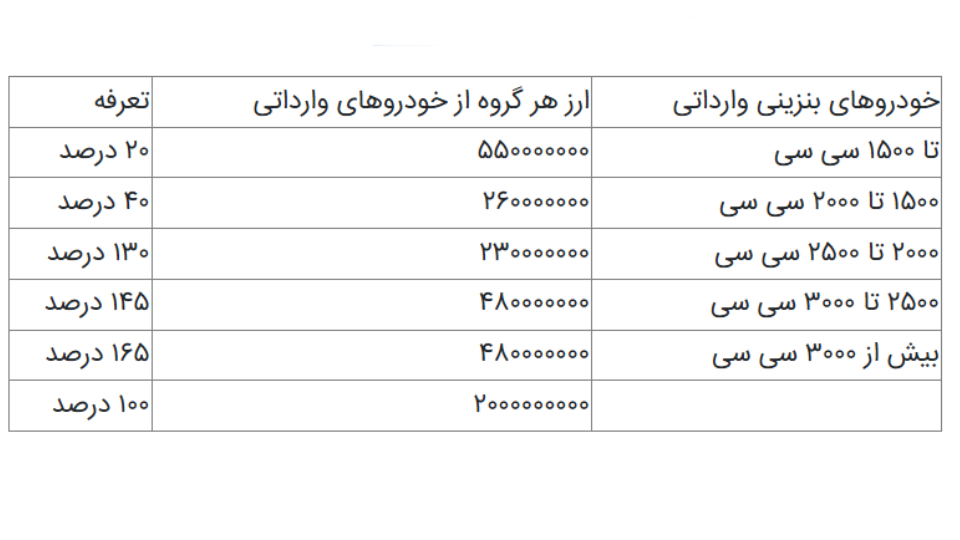 به گزارش ایرنا، بر این اساس جدول تعرفه واردات خودرو که میزان تعرفه هر گروه خودرویی بر اساس حجم موتور را تقسیم بندی کرده بود، در آیین نامه دولت به قوت خود باقیست و به شرح زیر است: