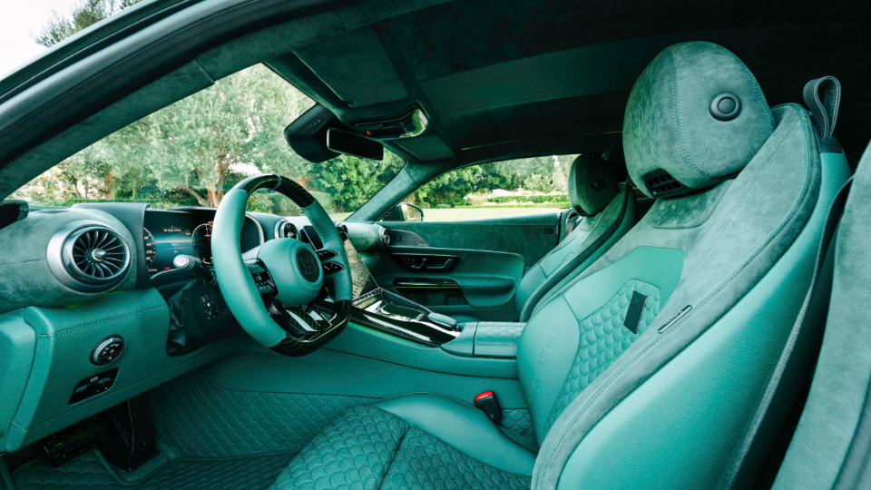 در فضای کابین برابوس راکت GTS مین گرین هم با روکش چرم سبز آهکی، نشان BRABUS روی پارکابی، بخش بالایی داشبورد با روکش آلکانترا و تریم فیبرکربن مواجه هستیم.