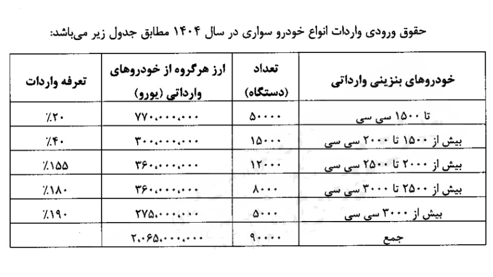 محمدعلی بهپوری، مدیرکل دفتر واردات گمرک جمهوری اسلامی ایران، اصلاحیه تصویبنامه 21 خرداد امسال هیأت وزیران در خصوص آییننامه اجرایی بند «ر» ذیل تبصره یک ماده واحده قانون بودجه سال ١٤۰٤ کل کشور پیرامون واردات انواع خودرو در سال ١٤۰٤ را به گمرکات اجرایی کشور ابلاغ کرد.