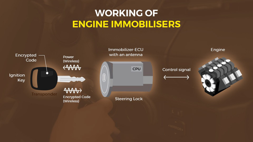وقتی کلید داخل سوئیچ قرار میگیرد یا دکمه استارت فشرده میشود، یک کد دیجیتالی از کلید به ECU ارسال میشود. اگر کد با دیتابیس ECU منطبق باشد، پیشرانه روشن میشود وگرنه ایموبیلایزر با قطع سیستم تزریق سوخت یا جرقه، از روشن شدن پیشرانه جلوگیری میکند.