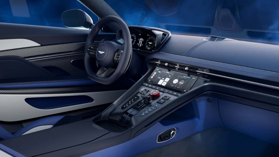 در فضای کابین استون مارتین DB12 S میتوان کلید گردان فلزی انتخاب حالت رانندگی به رنگ قرمز و همچنین حرف S روی پشتی صندلیها را مشاهده کرد. خریدار میتواند یکی از سه رنگ موجود را برای تریم چرم و آلکانترا، انتخاب کند.