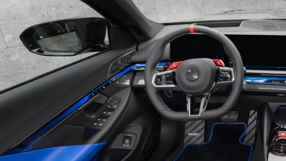گذشته از تغییرات ظاهری عجیب، باید به کابین این بامو M5 اشاره کنیم که روکش چرم آبی صندلیها و بخشی از پوشش داخلی درها را به همراه دارد. یک نوار آبی هم از پوشش داخلی درها تا روی داشبورد، امتداد دارد. باید اعتراف کنیم که برخلاف طراحی ظاهری و البته انتظاری که از محصولات منصوری داریم، فضای داخلی این ب ام و M5 کمتر عجیب به نظر میرسد.