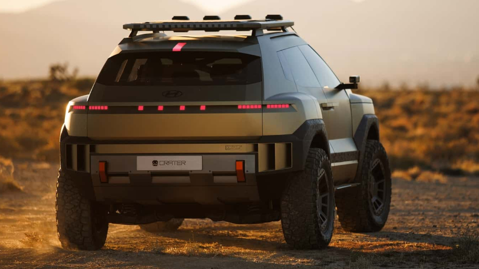 هیوندای کریتر (Crater) با تایرهای 33 اینچ آفرود، محفاظ زیر سپر، قلاب یدککشی و چراغهای سقفی LED با طرح پیکسلی مشابه با آیونیک 5 XRT، چهرهای کاملا جدی و آماده برای بیراههنوری را به نمایش میگذارد. نام این خودرو به معنای حفره حاصل از آتشفشان یا برخورد شهاب سنگ نیز احتمالا به قابلیت آن برای عبور از مسیرهای مختلف اشاره دارد.