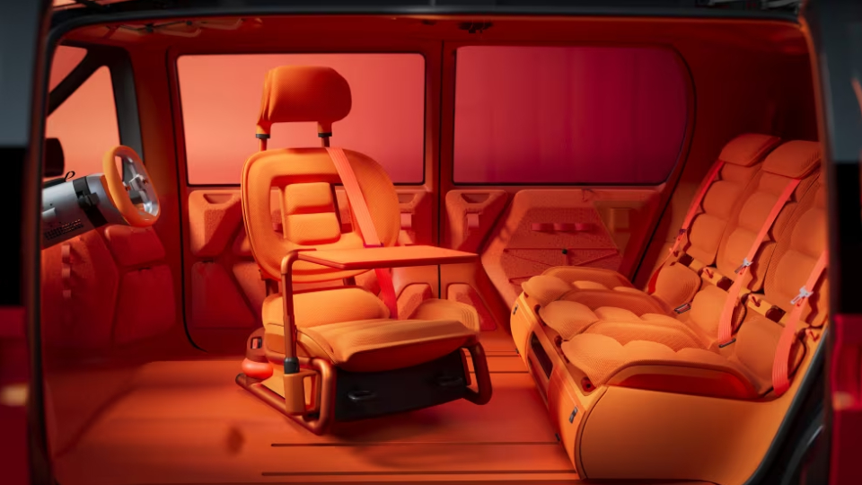 سرنشینان جلو نسبت به راننده کمی عقبتر نشستهاند، تا پاهایشان به قوس گلگیرهای جلو برخورد نکند. هنگام توقف، صندلی راننده را میتوان به طرف سرنشینان عقب چرخاند و یک میز غذاخوری به آن متصل کرد. نشیمنگاه نیمکت عقب را میتوان جدا و به عنوان صندلی پیکنیک، استفاده کرد.