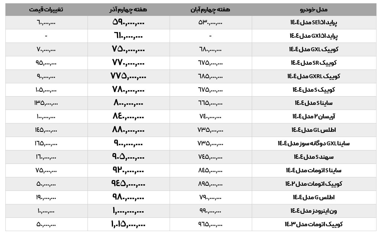 بررسی تازهترین آمارهای بازار خودرو نشان میدهد که موج جدید گرانیها، خودروهای زیر یک میلیارد تومان را به شدت تحت تأثیر قرار داده است. مقایسه قیمتها میان هفته چهارم آبانماه 1404 و هفته چهارم آذرماه 1404 حکایت از آن دارد که بخش عمدهای از محصولات پرتیراژ، افزایش قیمتهای میلیونی و در برخی موارد فراتر از 100 میلیون تومان را در بازه زمانی تنها یک ماه تجربه کردهاند.