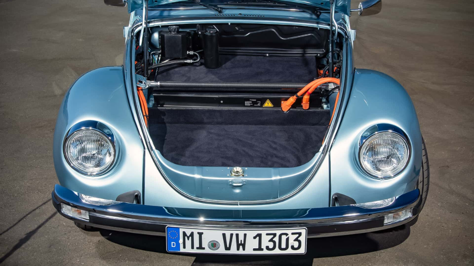 بعید است که در نگاه اول به این فولکس بیتل با رنگ آبی ماراتون، متوجه نکته خاصی بشوید. اما پس از نگاه نزدیک، عدم شنیدن صدای پیشرانه و البته مشاهده هرزگردی چرخهای عقب، متوجه میشوید که با یک هیولا روبرو هستید. مهمترین تغییر این خودرو چیزی نیست جز حذف پیشرانه هوا/خنک و پر سروصدای بیتل که حالا جای خود را به یک موتور برقی سه فاز داده است.