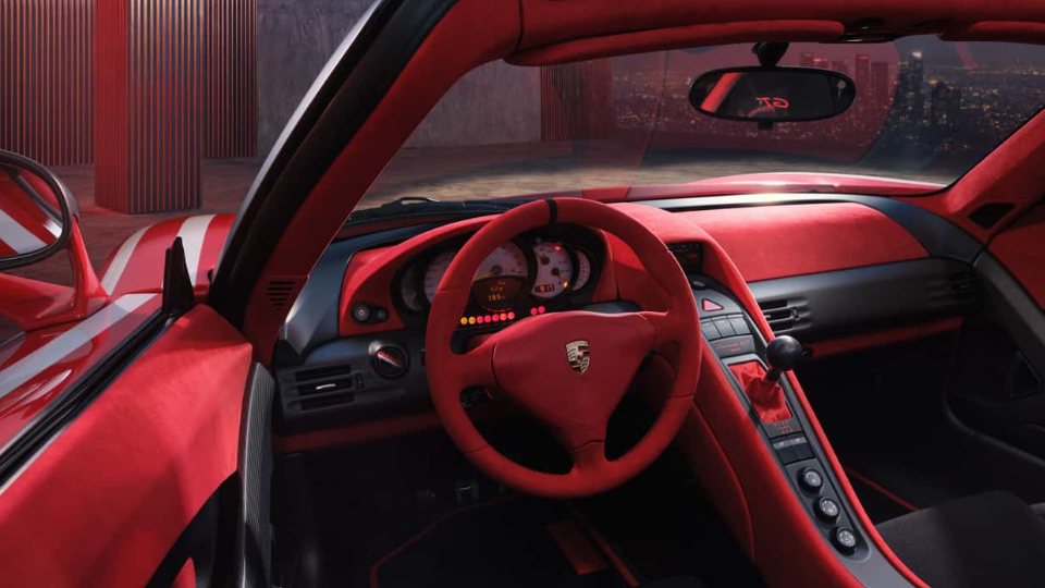 کابین هم به طور کامل دگرگون شده است. بخش وسیعی از فضای داخلی شامل داشبورد، رودریها، فرمان و کنسول میانی، با روکش آلکانترا به رنگ قرمز تزئین شده است. استفاده از آلکانترا حتی به صندوق جلو هم تسری پیدا میکند، جایی که یک ست چمدان نیز قرار دارد. البته برای روکش برخی سطوح، از پارچه مشکی متعلق به جانشین کررا GT یعنی 918 اسپایدر استفاده شده است. پوسته صندلیها، اطراف صفحه آمپر و دریچههای هوا هم از کربن مات ساخته شده است.